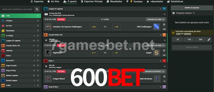 O 600Bet oferece uma grande seleção de opções de apostas em e-sports com probabilidades competitivas
